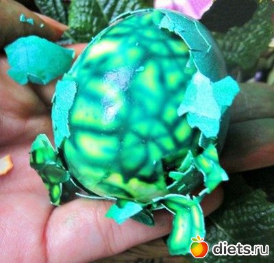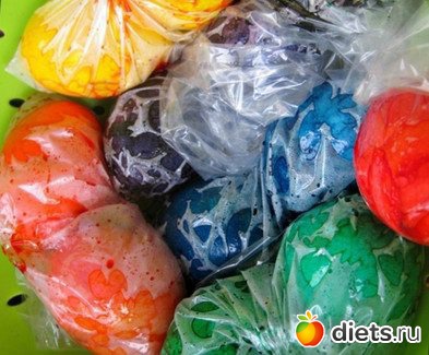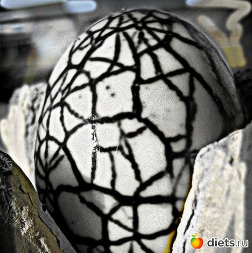 Яйца варим вкрутую, слегка остужаем, чтобы рукам не было горячо. И аккуратненько разбиваем ложечкой так, как наметили, чтобы получилась мозаика. Потом кладём яйца в целлофановые пакеты с разными (приготовленными так, как написано в инструкции) красителями, ждём необходимое время. Вынимаем из пакетов, убираем скорлупу, яйца под ней красиво и съедобно окрасились.