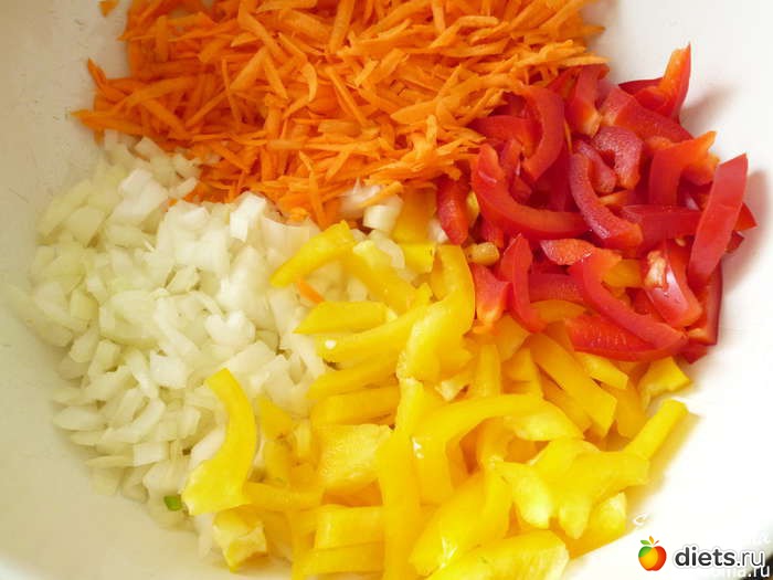 Лук нарезать мелко, морковь натереть на крупной терке, перец нарезать соломкой.