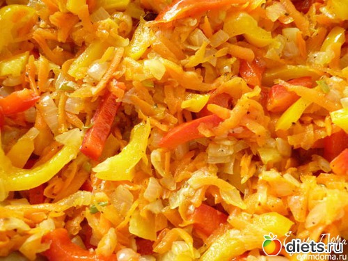 Нагреть сковороду с растительным маслом на небольшом огне, репчатый лук обжарить до прозрачности, добавить морковь, обжарить вместе с луком 10-15 минут, помешивая, посолить и поперчить (я еще добавила немножко молотой красной паприки и лавровый листик маленький), добавить нарезанный перец и прогреть 3-4 минуты под крышкой, что бы перец немножко обмяк. Остудить.