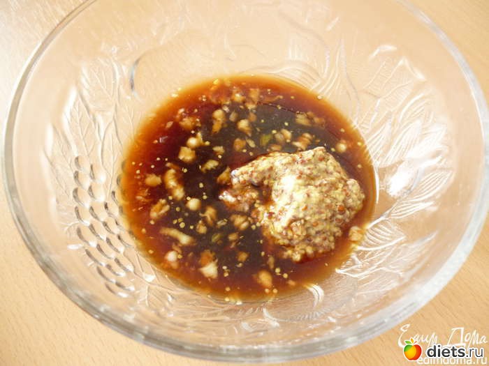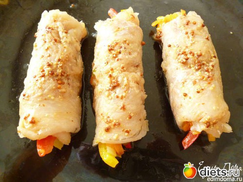 Складываем на блюдо или доску швом вниз. И опять смазываем маринадом.