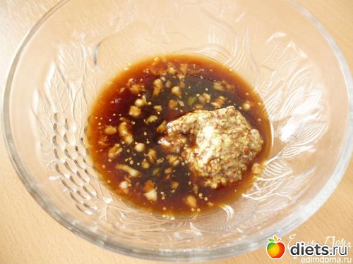 Приготовить смесь для маринада: смешать горчицу, соевый соус, лимонный сок и измельченный чеснок. Приготовить отдельно тарелку с мукой для панировки рулетиков.