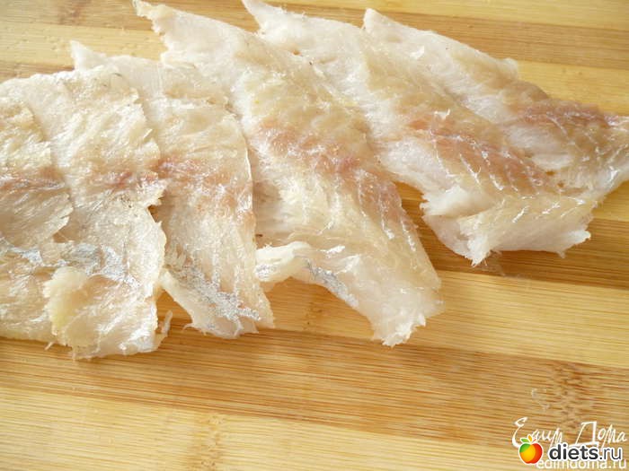 Филе рыбы нарезать под острым углом полосками шириной около 4-х см