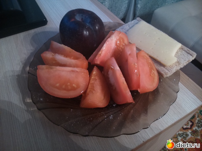 Когда вернулись домой, ничего тяжелого на ужин уже не хотелось, поэтому ужин такой - помидор, хлебец с сыром, слива...