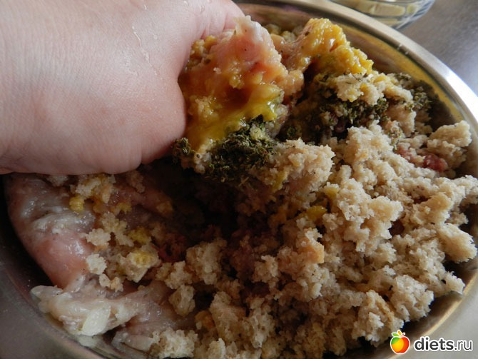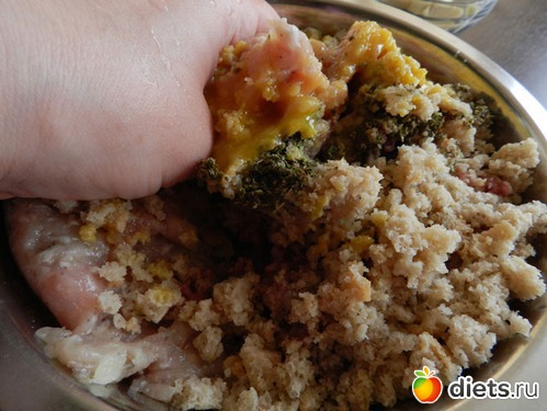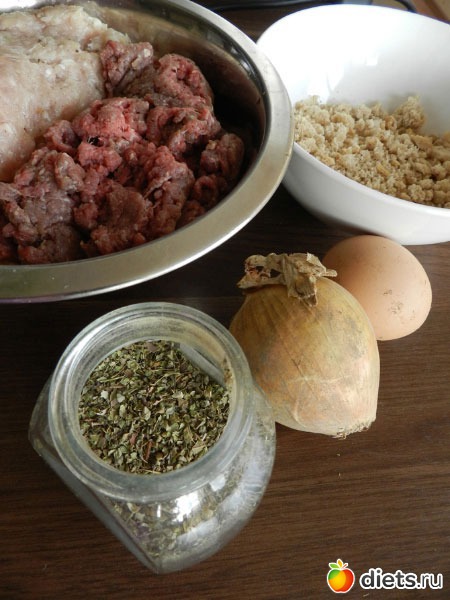Смешиваем оба сорта фарша, добавляем отжатые сухари, яйцо, майоран, натёртый на мелкой тёрке лук репчатый, соль и перец. Тщательно вымешиваем.