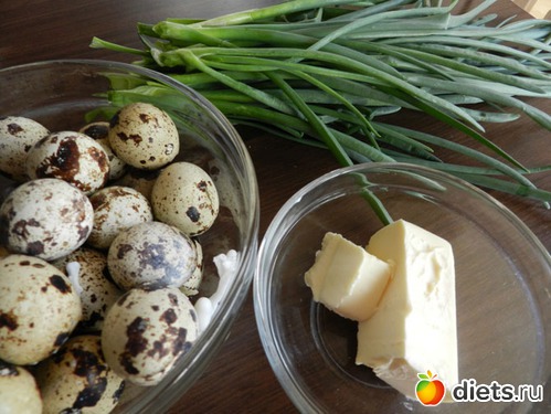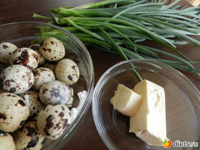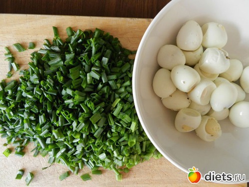 Перепелиные яйца лучше отварить заранее примерно 6-7 минут в кипящей воде. Затем непременно нужно переложить их в миску с холодной водой – тогда скорлупу снять можно значительно проще. Зелёный лук шинкуем.