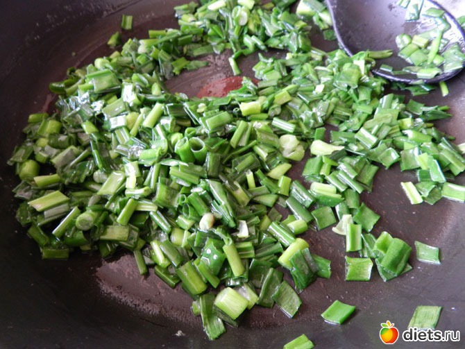 Сковороду нагреваем (но не раскаляем), даем сливочному маслу распуститься и сразу добавляем зелёный лук. Наша задача не поджарить его, а слега припустить. Чтобы сливочное масло полностью его обволакивало. На медленном огне держим не больше минуты.
