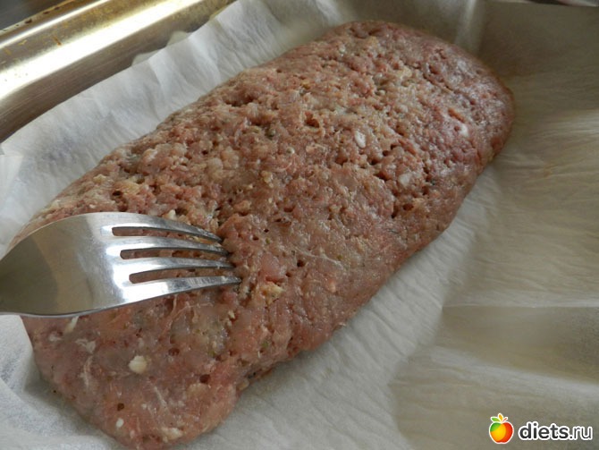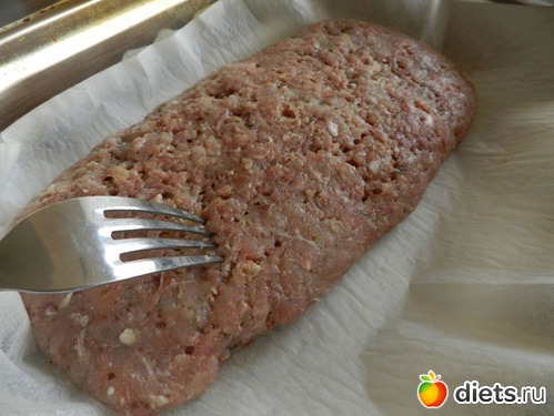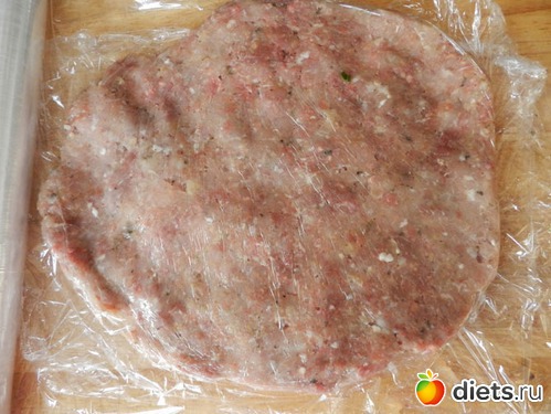 Между двумя слоями пищевой плёнки раскатываем фарш, стараясь придать продолговатую форму. Одновременно ставим духовку разогреваться до 180 градусов.