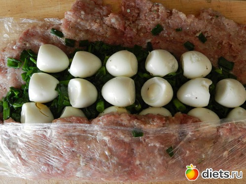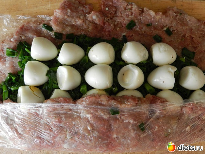 В центр фарша выкладываем сначала лук, а поверх него плотными рядами яйца, по 3-4 штучки в ряд. Затем с помощью нижнего слоя пищевой плёнки приподнимаем длинные края и внахлёст соединяем края фарша. Затем то же делаем с короткими краями. Шов легко разглаживается руками, смоченными водой.