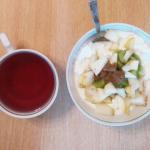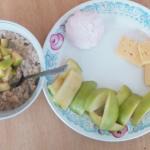 Завтрак: ячневая каша с обезжиренным молоком и яблоком, сыр и половинка зефира, кофе