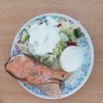Обед: запеченный кижуч, салат из свежей капусты, огурцов и редиса с йогуртом, яичный белок