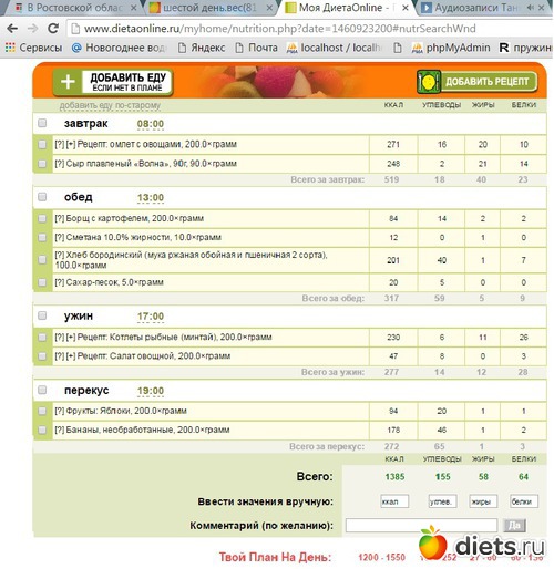 Примерно прикинула твое меню - жиры на грани, как понимаешь без точного веса и пропорций считать трудно. Тебе надо каждый прием пищи прям досконально забивать в калькулятор. Пока не поймешь что сколько чего дает. Я привыкла считать на диете онлайн, но тут тоже есть подобный калькулятор. Соотношение белков-жиров-углеводов. Изначально все-все надо взвешивать. А то думаешь что вес один, а на самом деле он другой. Вот недельку так позабиваешь и будет видно что получается.