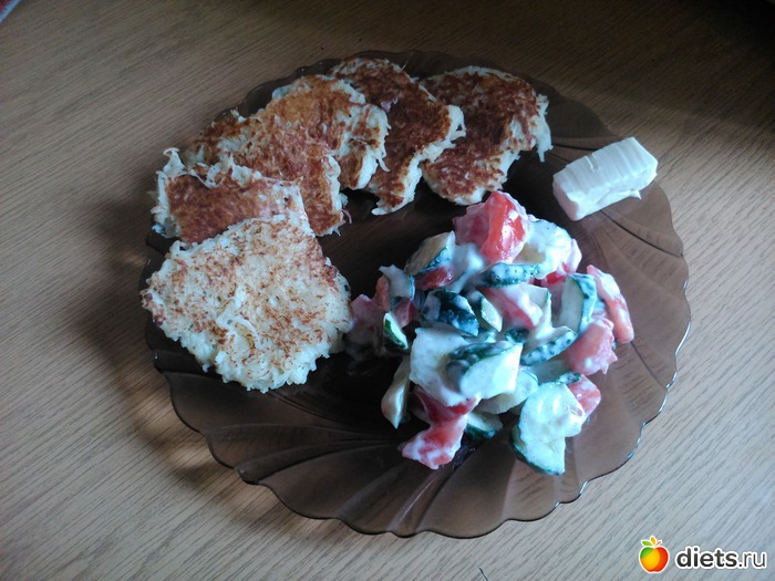 Обед - готовила мальчикам драники и так мне захотелось, поэтому пожарила несколько штук (без масла), салат, кусочек плавленного сыра...