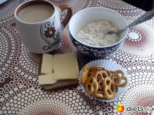 Завтрак - овсяная каша + бутерброд с сыром + крендельки + кофе с молоком