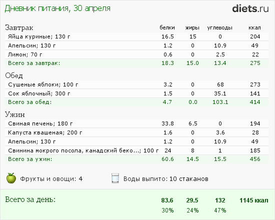 Diets.ru 30 апреля шестой день первой недели