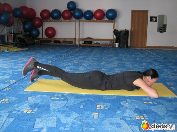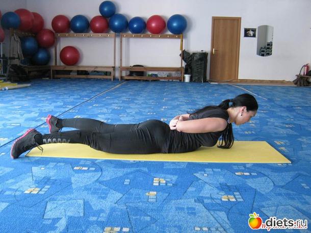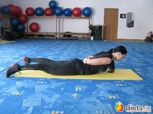 переворачиваемся на живот и поднимаем верхнюю часть тела 20 раз, на выдохе!