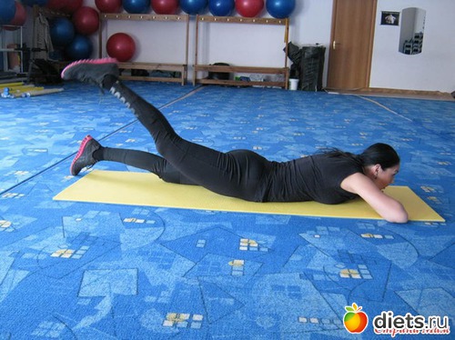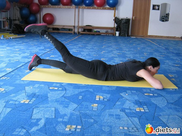 лежа на животе отрываем от пола 20 раз правую ногу (таз прижат к полу, нога прямая), потом левую. Все упражнения делаем на выдохе!