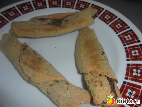 Разрезать тесто на порции. Используя ц/з муку для подпыления поверхности, раскатать квадратиком каждую порцию теста. Порезать по диагонали на 2 треугольника. Одну сторону треугольника смазать начинкой. И накрыть вторым треугольником. Аккуратно раскатать. Свернуть в трубочку, начиная с более широкого конца. Положить на смазанную маслом, пекарскую бумагу. Трубочка готова!