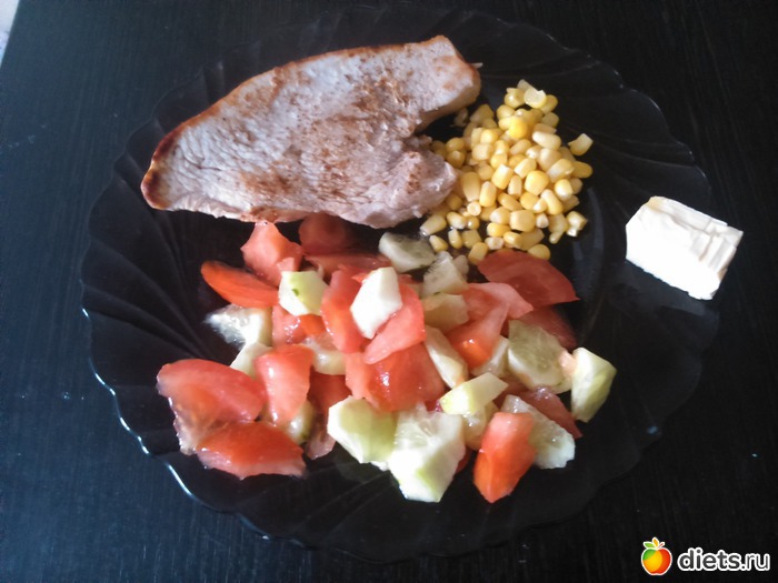 Обед - стейк индейки, кукуруза, салат, кусочек плавленного сыра...