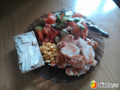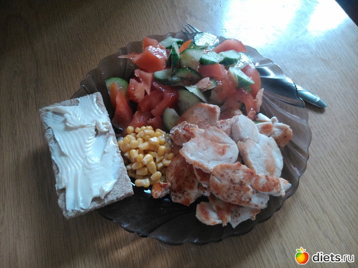 Обед - куриная грудка, обжаренная на сухой сковороде, салат, кукуруза, хлебец с сыром..