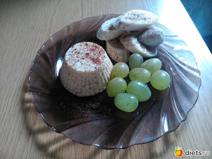 Перекус - творожно-яблочное суфле, немного банана, немного винограда...