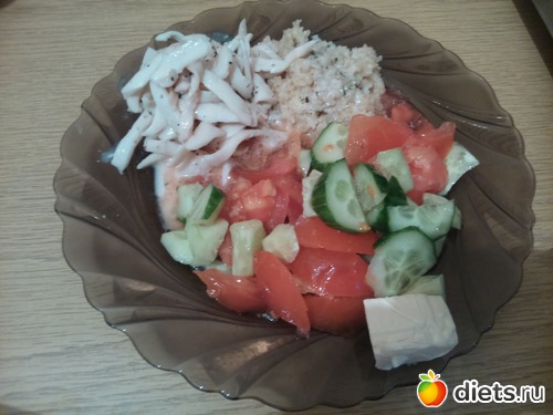 Ужин - немного пшеничной каши, салат, кальмар тушеный в натуральном йогурте, плавленный сыр...