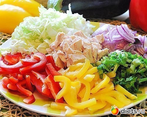 1. Луковицу нарезать полукольцами, перец нарезать соломкой, зеленый лук и капусту нашинковать, курицу нарезать кубиками.