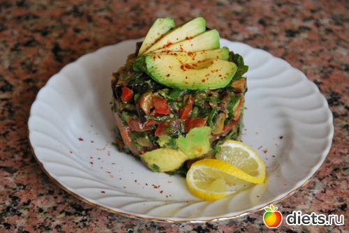 зелёный лучек и cбрызнyла лимонным соком.Авокадо нарезать в салат,оливковое масло.Перемешать.