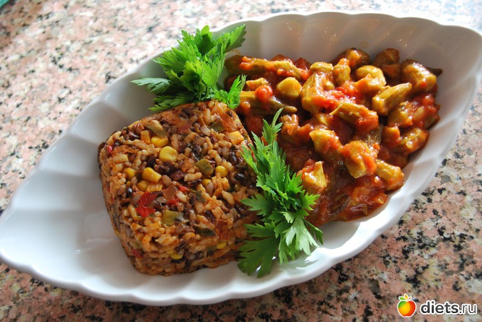 Обед, ужин:рис с овощами, тушеная бамия в томатном соусе