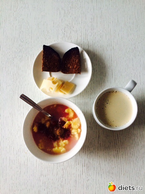 Завтрак: кукурузная каша с вишней, корицей и рисовым молоком, хлебцы для худеющих Боско (по сути цельнозерновой хлеб, очень вкусный и не калорийный), сыр, кофе