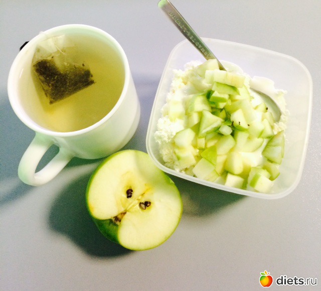 Ланч: творог 1% с йогуртом 1,5% и яблоком, белый чай