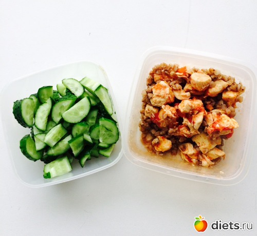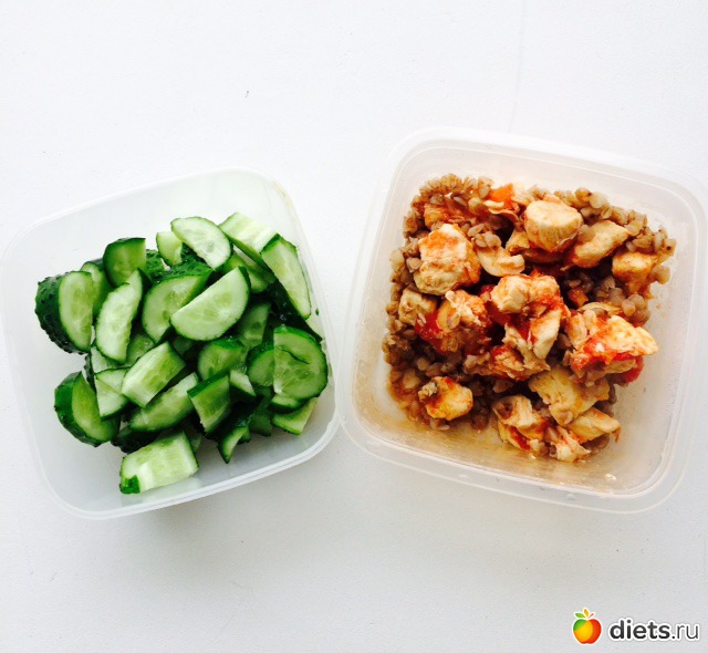 Обед: гречка с куриной грудкой в томатном соусе, огурцы