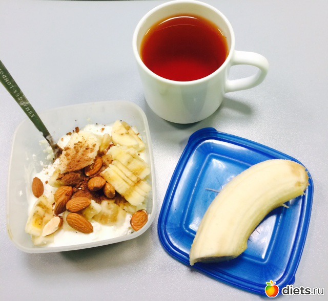 Полдник: творог 1% с йогуртом 1,5%, бананом, какао и миндалем, липовый чай