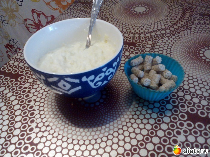 Перекус - 80г 5% творога + немного кефира + половина яблока + отруби 10г