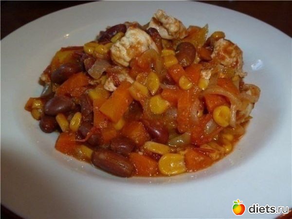6. К овощам добавить красную фасоль (если используется консервированная, то необходимо предварительно слить жидкость). На этом этапе необходимо посолить блюдо и добавить специи (я кладу по половине чайной ложки корицы, сушеного чеснока, сушеной паприки, сушеного молотого томата и около трети чайной ложки молотого перца чили).