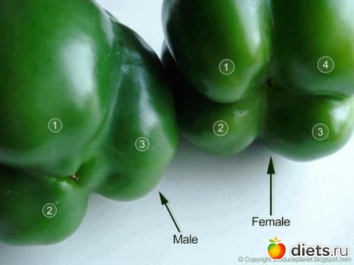 Переверните болгарские перцы, чтобы узнать их пол. Если внизу 3 секции - плод мужской, если 4 - женский. Женские плоды полны семян и более сладкие, лучше подходят для употребления сырыми.
