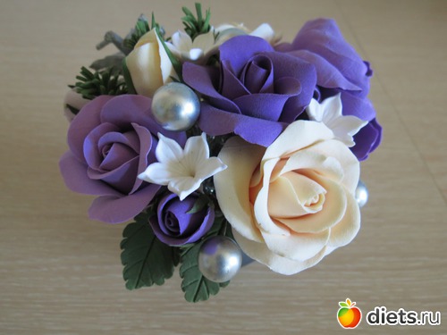 Вот дружит человек с мелкой моторикой и чувство прекрасного есть, она ещё бисером вышивает картины, а вот эти полимерные цветы у неё одинаково красиво смотрятся как в вазочках, так и на разных "девочкиных радостях" типа заколок, ободков, на бокалах и стеклянных вазах, мастерица! На " мальчиковых радостях" тоже хорошо смотрятся, например простые бутылки под её золотыми ручками тоже становятся произведениями искусства, каждая по своему.
