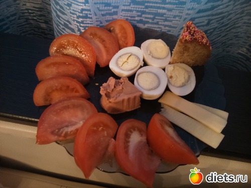 Ужин - получился сборный, помидор, немного сыра, паштет из индейки, 2 яйца, кусочек кулича (муж не ест, а выбросить жалко, поэтому по кусочку буду доедать)..
