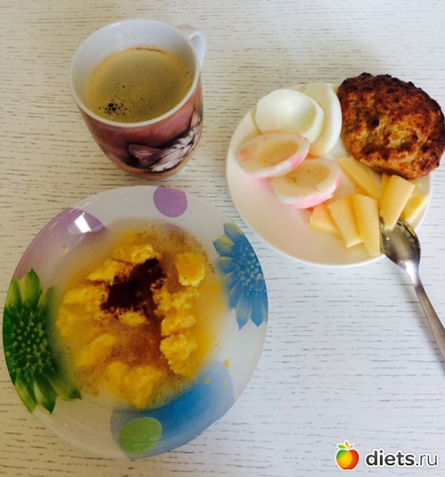 Завтрак: кукурузная каша с корицей и рисовым молоком, сыр, 2 яичных белка, сырник домашний, кофе
