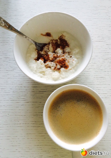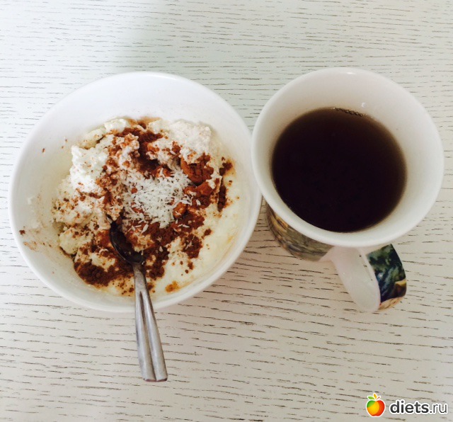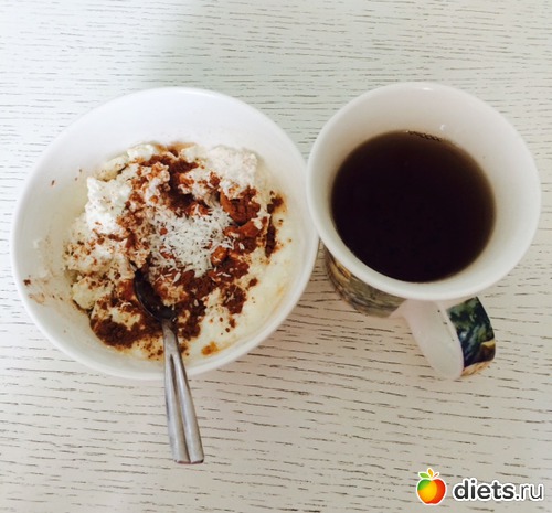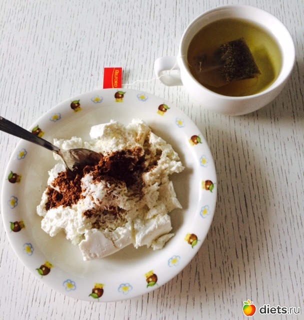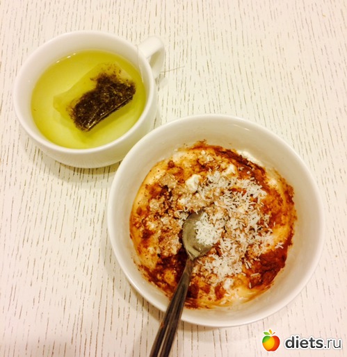 Ужин: творог с какао и кокосовой стружкой, ромашковый чай