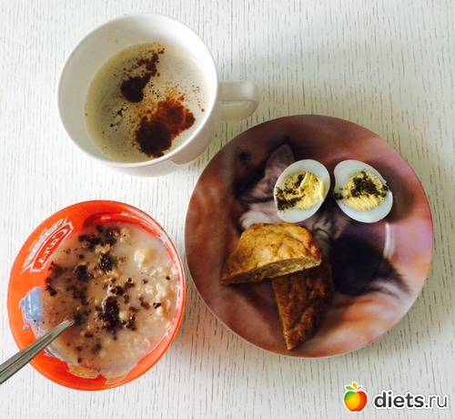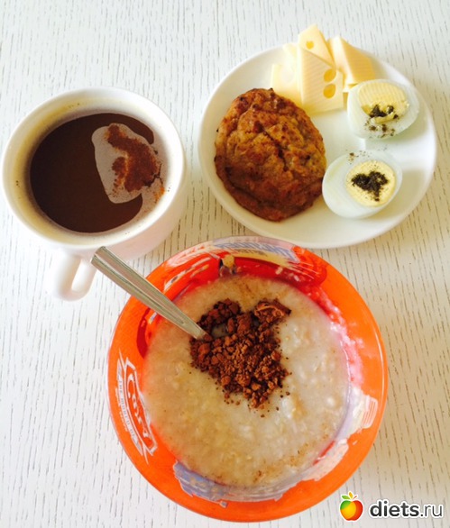 Завтрак: овсяная каша с какао и рисовым молоком, яйцо, сыр, домашний сырник, кофе