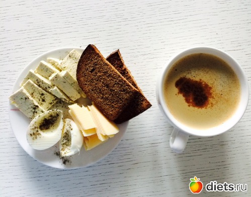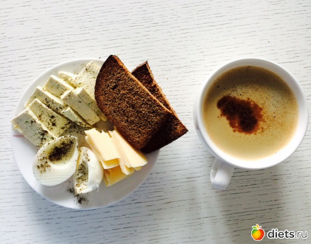 Обед: цельнозерновой хлебец, яичный белок, тофу и сыр, кофе