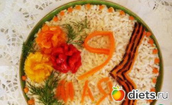 4. Сладкими перцами украсить салат сверху, морковью и темным рисом выложить георгиевскую ленту.
