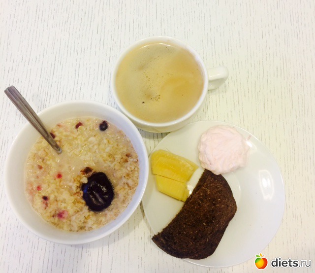 Завтрак: овсяная каша с фруктами и соевым молоком, сыр, хлеб, зефирка, кофе (завтрак почти всегда у меня одинаковый, менять не хочу, уже как традиция...)