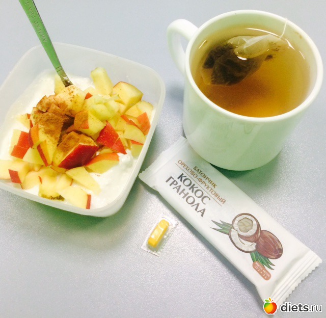 Ланч: творог с яблоком и корицей, батончик фруктовый, чай, витаминка