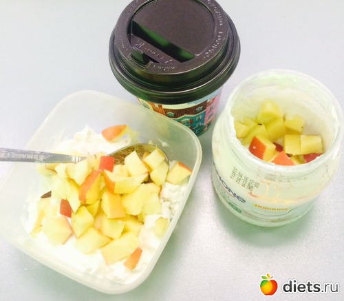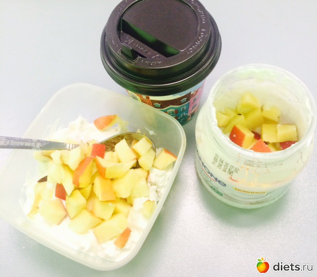 Полдник: творог с яблоком, кофе, ну и покрошила остатки яблока в остатки йогурта)))