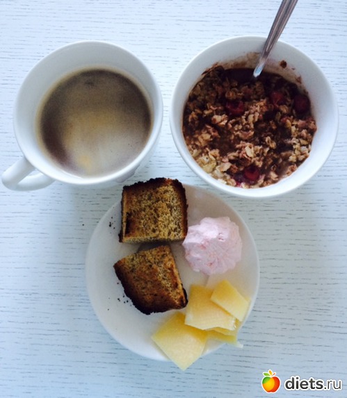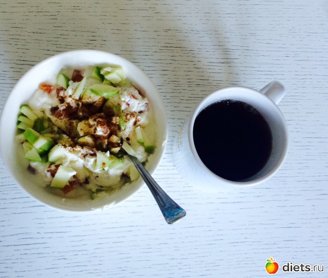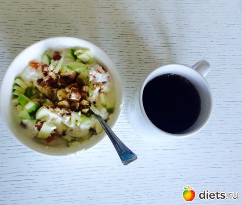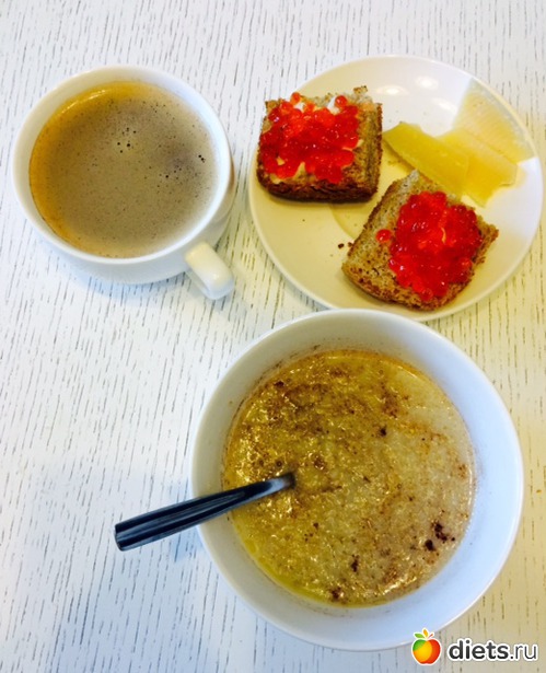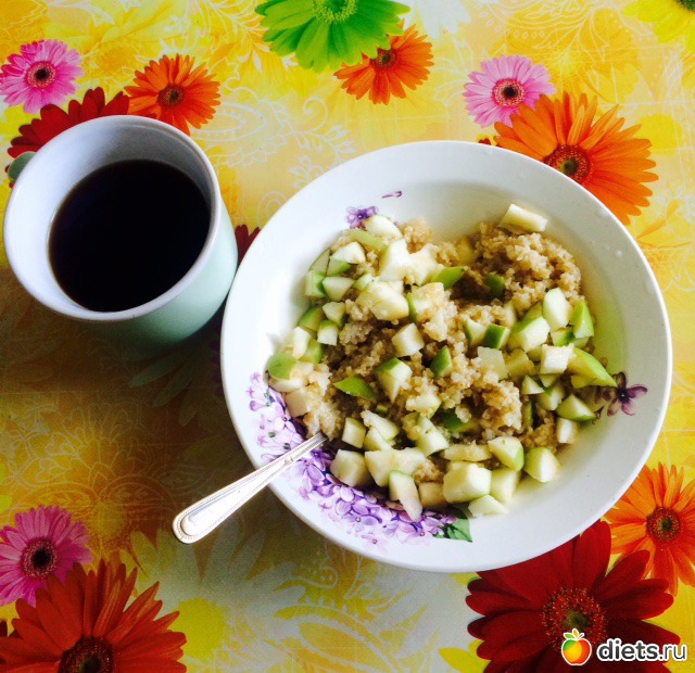 Завтрак: пшеничная каша с яблоком, кофе (растворимый...бррр, сто лет не пила, надеюсь, еще столько же не пить...)