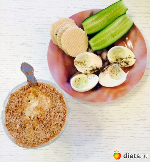 Ужин: кефир с клетчаткой, 2 яичных белка, хлебцы, огурец
