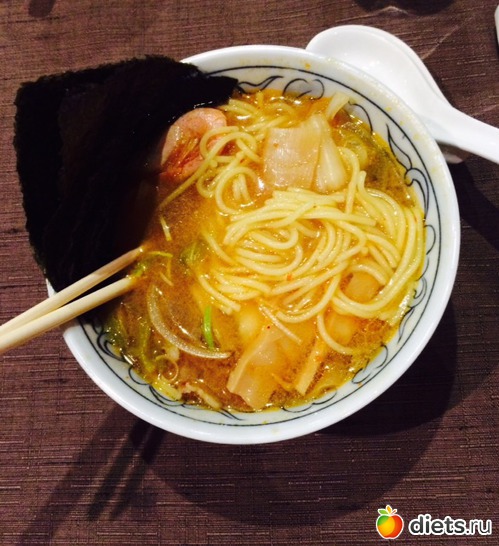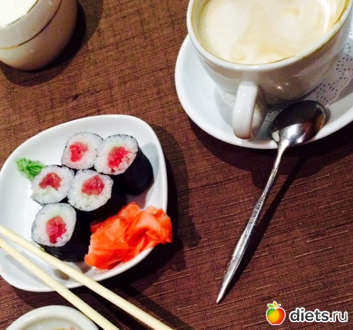 Обед: роллы с тунцом, кофе, рамен (Долго выбирала японский несетевой ресторан, выбрала и осталась разочарована слегка...рамен со спагетти - это что-то за гранью моего понимания, там должна быть совсем другая лапша