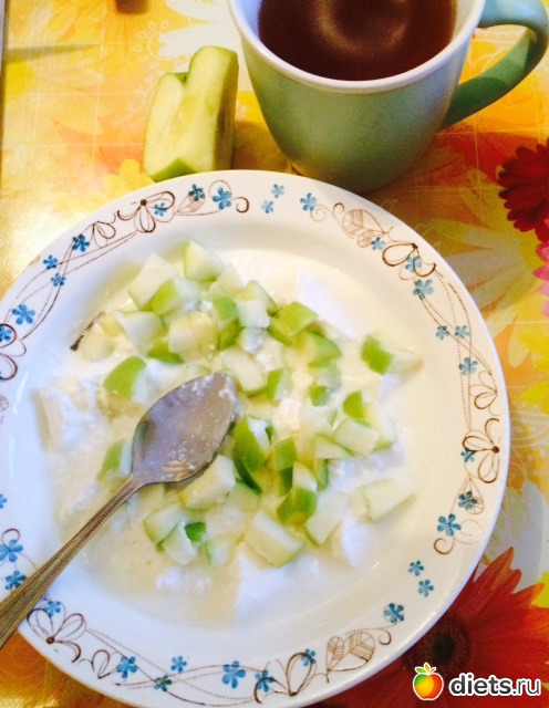 Ужин: творог с яблоком и кефиром, чай