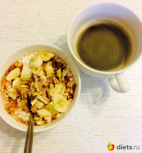 Ужин (уже дома, ура): творог с бананом и какао, кофе